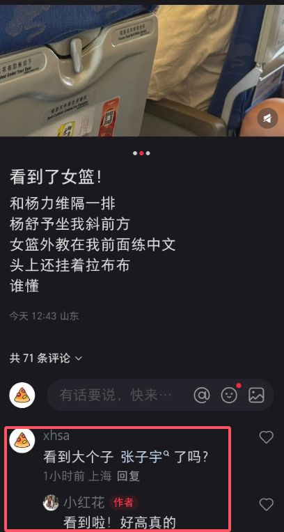 有网友在航班上碰到了中国女篮,发现张子宇跟着国家队一同乘飞机前往西安,参加下一站热身赛。